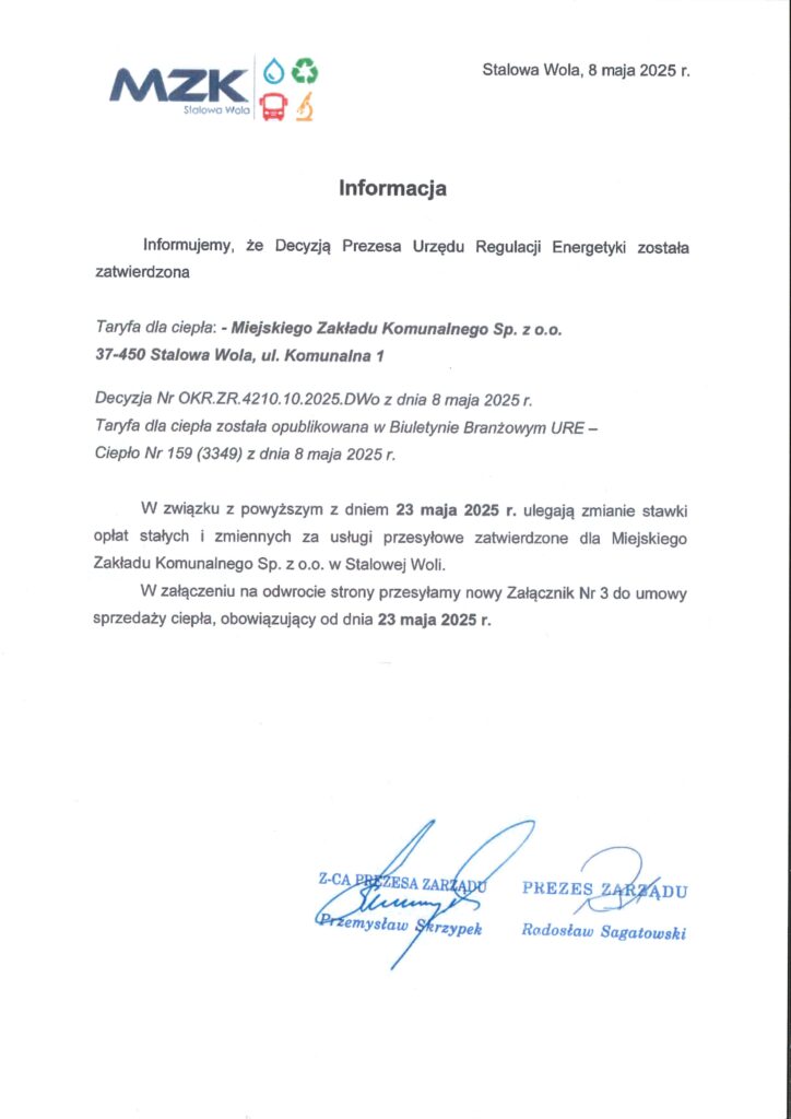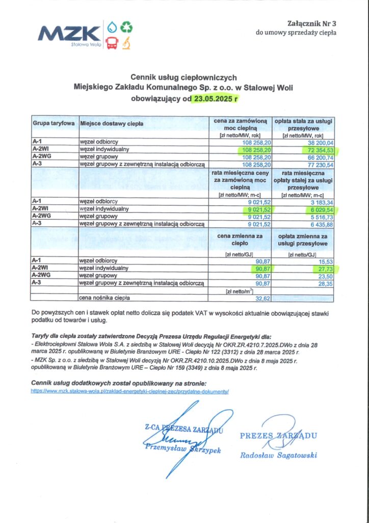 Informujemy o wprowadzeniu nowego cennika usług ciepłowniczych przez Miejski Zakład Komunalny Sp. z o.o. w Stalowej Woli. Na podstawie decyzji Prezesa Urzędu Regulacji Energetyki, od 23 maja 2025 roku obowiązywać będą nowe stawki opłat stałych i zmiennych za usługi przesyłowe, zatwierdzone dla MZK Sp. z o.o.